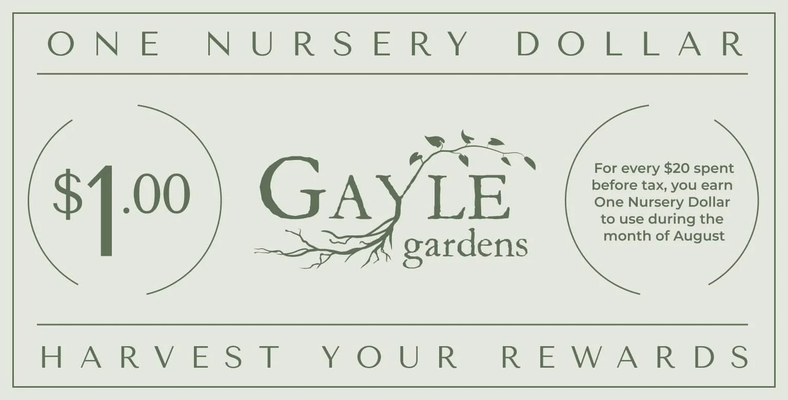 Think of Nursery Dollars as nourishment for future purchases. They work like cash, covering up to 50% of your pre-tax total on a single transaction. For Example, a $100 purchase can apply up to $50 in Nursery Dollars. Your Gayle Dollars support the whole ecosystem of your garden. That handcrafted pottery you've been considering? The quality tools that last seasons? A thoughtful gift for a fellow gardener? All eligible.