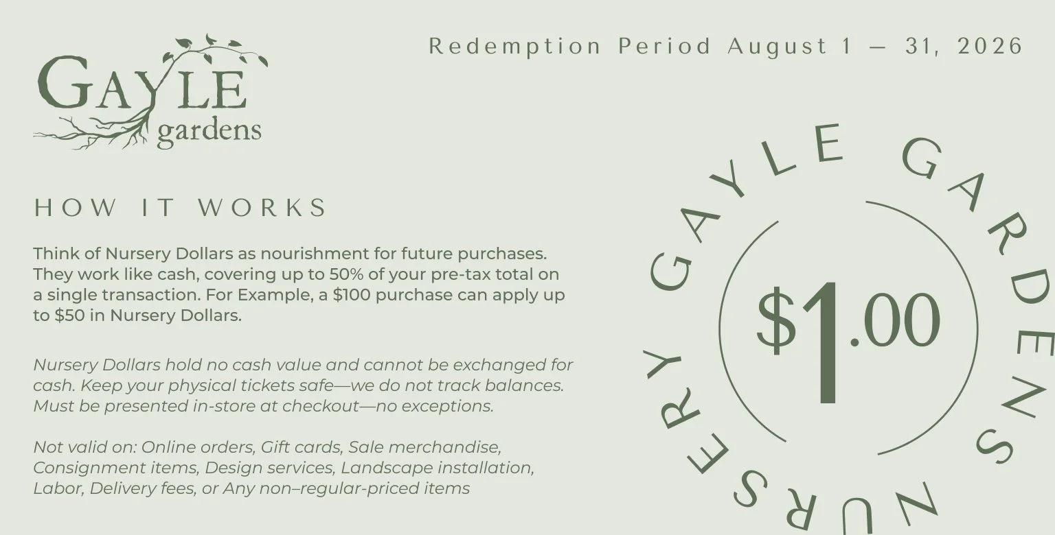 Nursery Dollars hold no cash value and cannot be exchanged for cash. Keep your physical tickets safe—we do not track balances. Must be presented in-store at checkout—no exceptions.
